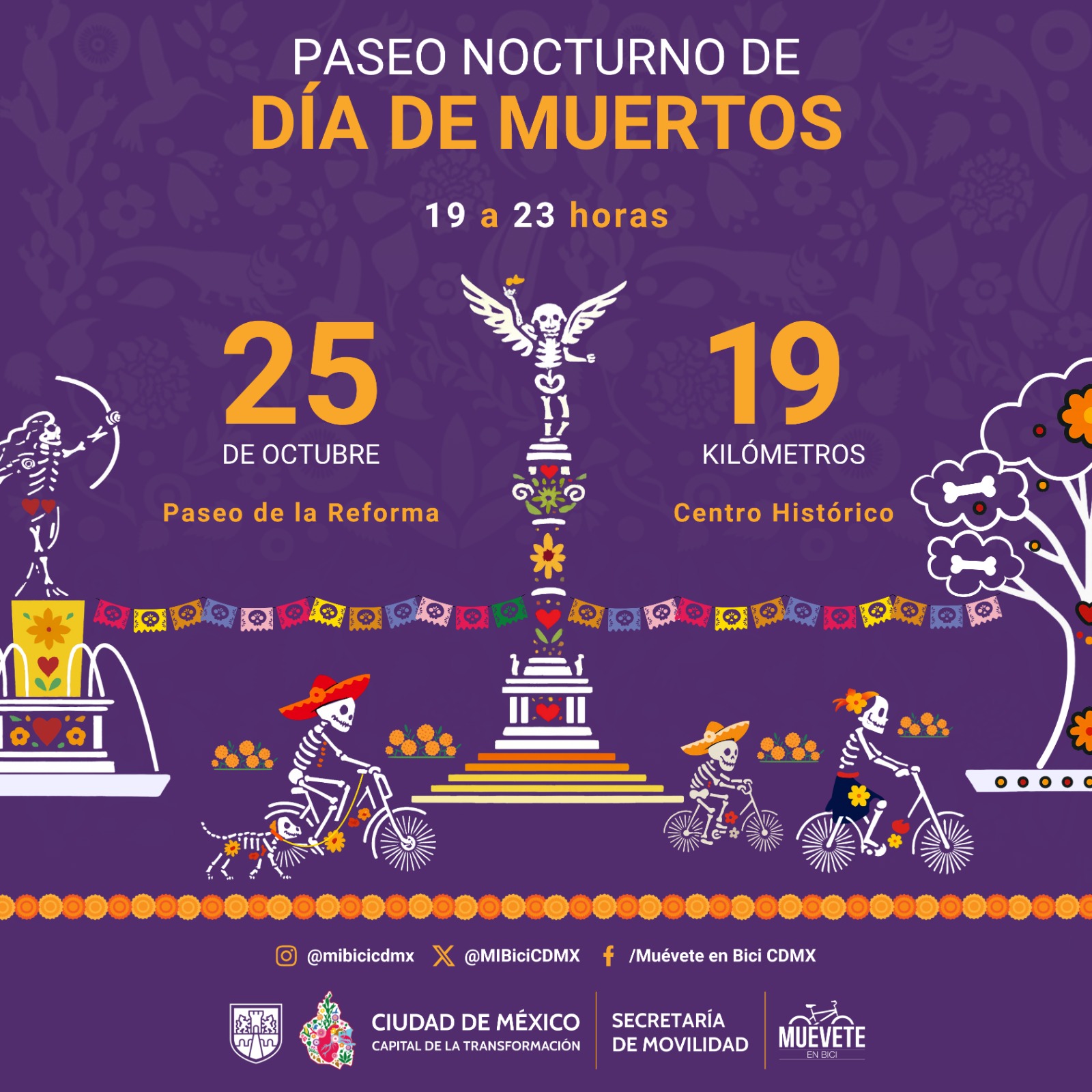 En el marco de las celebraciones del Gobierno de la Ciudad de México por la tradición mexicana de Día de Muertos, la Secretaría de Movilidad (SEMOVI) invita a ciclistas, patinadores, corredores y peatones a participar en el Paseo Nocturno “Muévete en Bici” que se realizará el próximo sábado 25 de octubre.