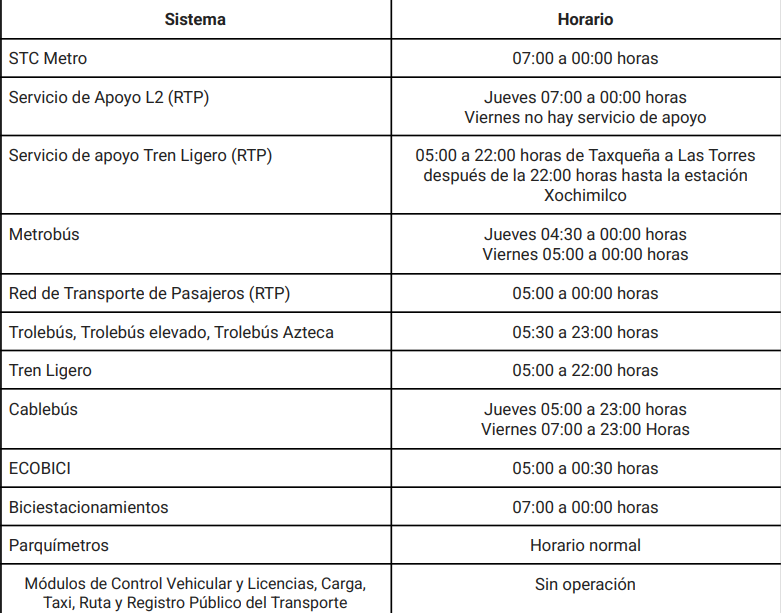 ajuste de horarios de operación de la Red de Movilidad Integrada (MI) para el próximo jueves 2 y viernes