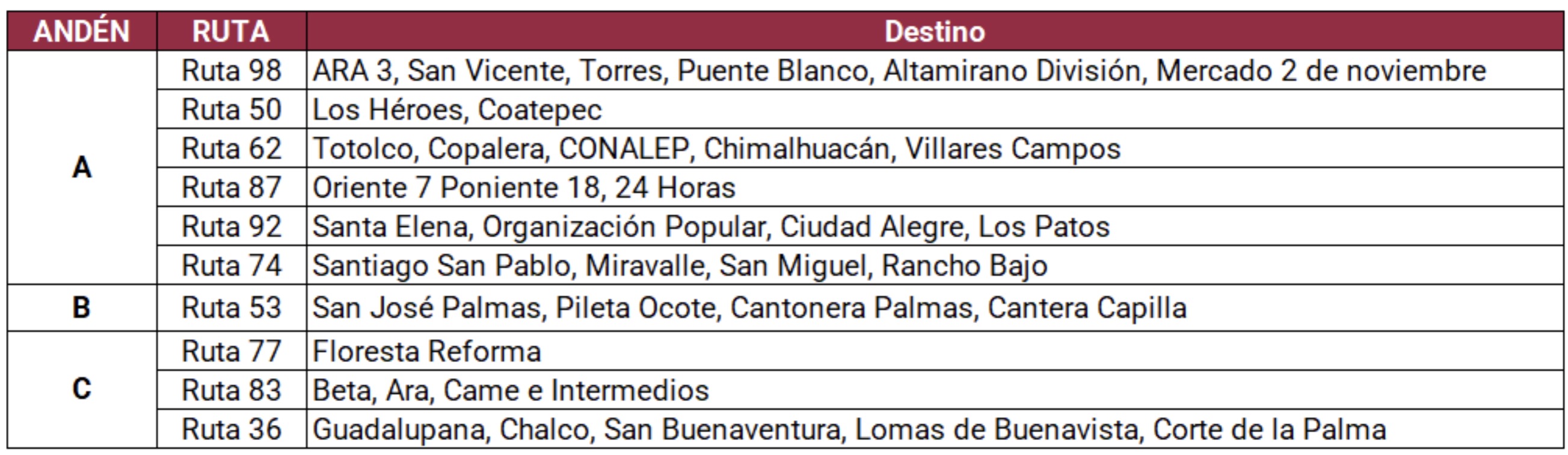 Derivado de los trabajos de rehabilitación realizados por la Secretaría de Infraestructura, Comunicaciones y Transportes (SICT), así como de las adecuaciones que actualmente lleva a cabo el SITRAMyTEM del Estado de México en el Centro de Transferencia Modal (CETRAM) “Santa Martha”, la Secretaría de Movilidad (SEMOVI) informa el reordenamiento temporal de las rutas que operan en los andenes de la sección poniente de este importante nodo de transporte.